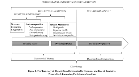 Today we observe new forms of care,7 thanks to the recent development of technologies applied to the field of molecular biology and genetics, which brought medicine from a standby medicine to a predictive and personalized medicine, the so called Predictive, Personalized, Preventive and Participatory (P4) medicine.8 This change is easily applicable to the field nutrition, and can lead to the development of new methods of diagnosis and personalized dietary intervention, on the basis of genetic makeup (nutrigenetic and nutrigenomic assessment), metabolic profile (clinical and biochemical assessment), body composition and energy expenditure (nutritional status assessment). 9-11