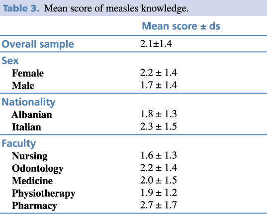 Table 2 shows answers on measles knowledge and perception, while Table 3 reported the score generated with the 306 students’ answers. The mean score was 2.1±1.4. No significant differences in relation to gender were found. Italian students had a higher knowledge of measles compared to Albanians (2.3 vs 1.8; p=.043).