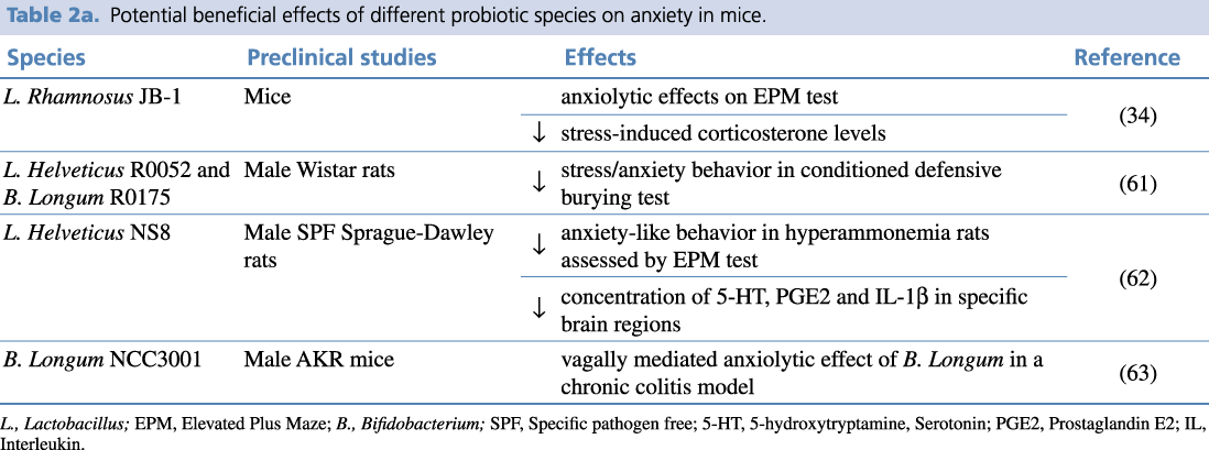 Table 2a. Potential beneficial effects of different probiotic species on anxiety in mice.