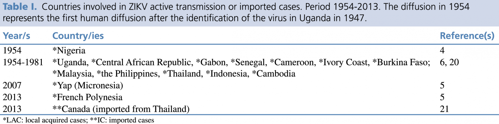 Table I. Countries involved in ZIKV active transmission or imported cases. Period 1954-2013. The diffusion in 1954 represents the first human diffusion after the identification of the virus in Uganda in 1947.