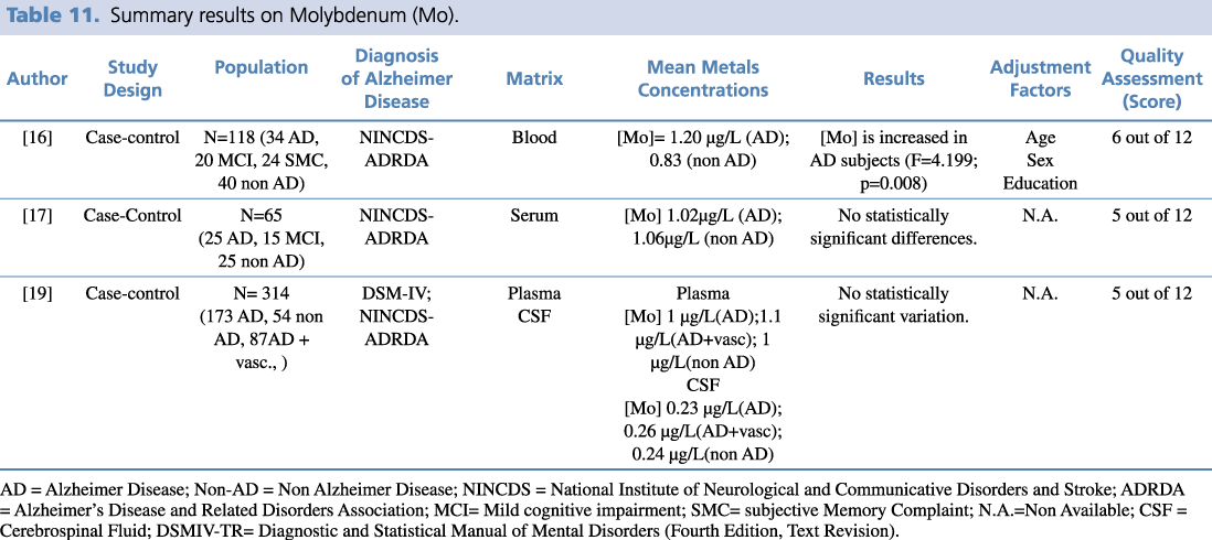 Among the three evaluated articles, only one16 reported an increase (p=0.008) in molybdenum blood concentration in patients with diagnosis of Alzheimer’s disease compared to healthy controls. No statistically significant changes in metal levels were found between cases and controls in the other two reports, irrespectively from the biological matrix investigated (blood, cerebrospinal fluid) (Table 11).