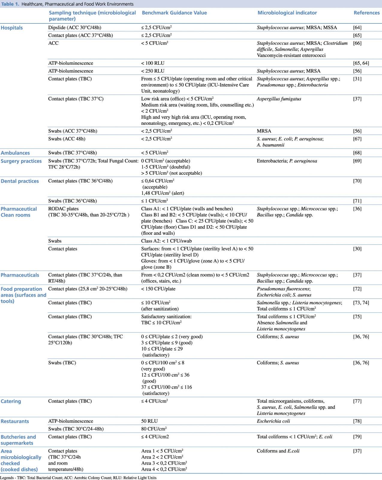 The literature on the quantitative evaluation of the levels of microbial contamination of the surfaces does not report standards or legislative references.62,63 The reported values are mostly finalized to estimate the cleaning efficacy of sanitation actions or to quantify and provide a general measure of bacterial load. Table 1 summarizes the benchmark values proposed by several authors in Healthcare, Pharmaceutical and Food work environments.