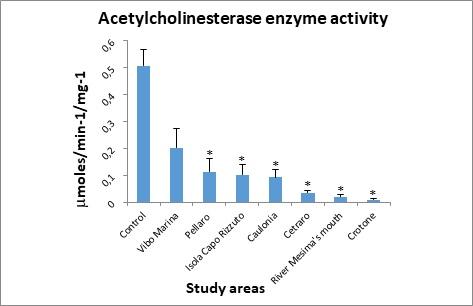 The reduction in AChE activity, in the Crotone (0.01 μmoles/min-1/mg-1), river Mesima’s mouth (0.0199 μmoles/min-1/mg-1), and Cetraro (0.0349 μmoles/min-1/mg-1) sites could be hypothesised as the result of a synergistic effect between organophosphate compounds (Chlorpyrifos: 0.186 ng/g, 0.57 ng/g and 0.4 ng/g; Chlorfenvinfos: 0.22 ng/g, 0.63 ng/g and 0.37 ng/g respectively) and zinc levels (145.02 μg/g, 92.3 μg/g and 122,12 μg/g respectively) measured.