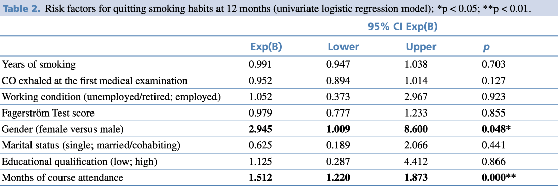 Table 2. Risk factors for quitting smoking habits at 12 months (univariate logistic regression model).