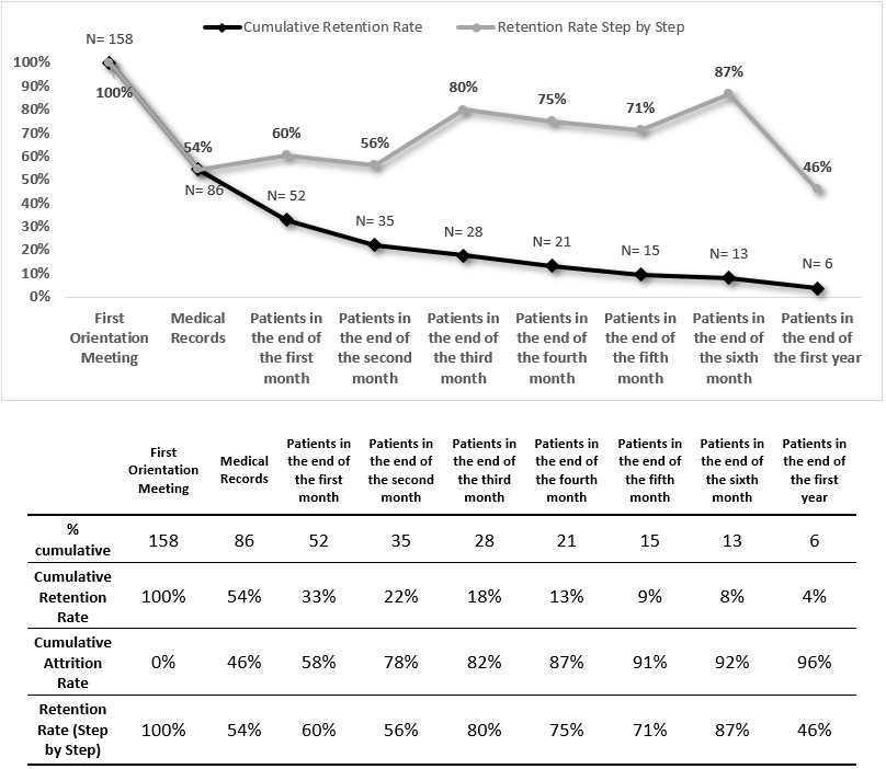As shown in Figure 1, the retention rate decreased in three different moments: between the first orientation meeting and the opening of the medical records (54% of subjects started the course), at two months of treatment (56% of the subjects moved from the first month of treatment to the second), and between six months and one year. In this case 46% of the subjects attending the program at six months have also reached the twelve months of the program.