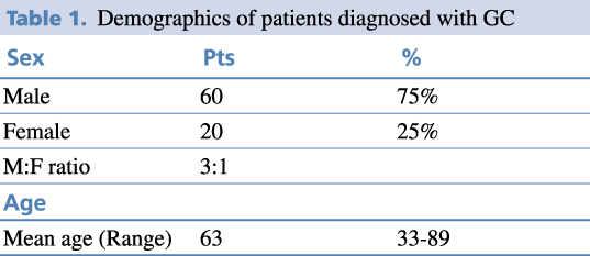 This retrospective analysis was performed on a total of 80 patients that underwent surgical procedures for gastric cancer (GC) at the First Service of General Surgery, UHC "Mother Theresa" in Tirana, Albania between January and December 2019.