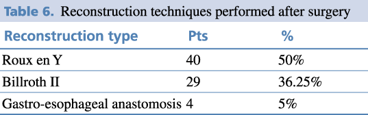 Common surgical procedures included total gastrectomy with D2 lymphadenectomy, followed by subtotal gastrectomy. The choice of gastric resection depended on tumor location and the ability to achieve R0-margin free of tumor. Total gastrectomy was prevalent in tumors of the stomach’s body, while subtotal resection was performed in the antrum-pyloric region and polar superior for cardia region in selected patients.