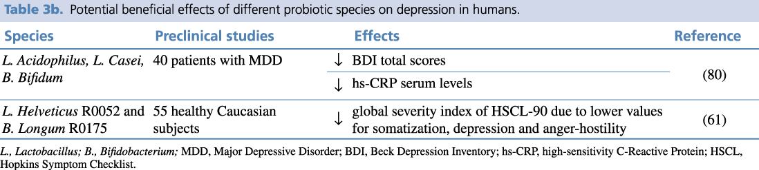 Table 3b. Potential beneficial effects of different probiotic species on depression in humans.