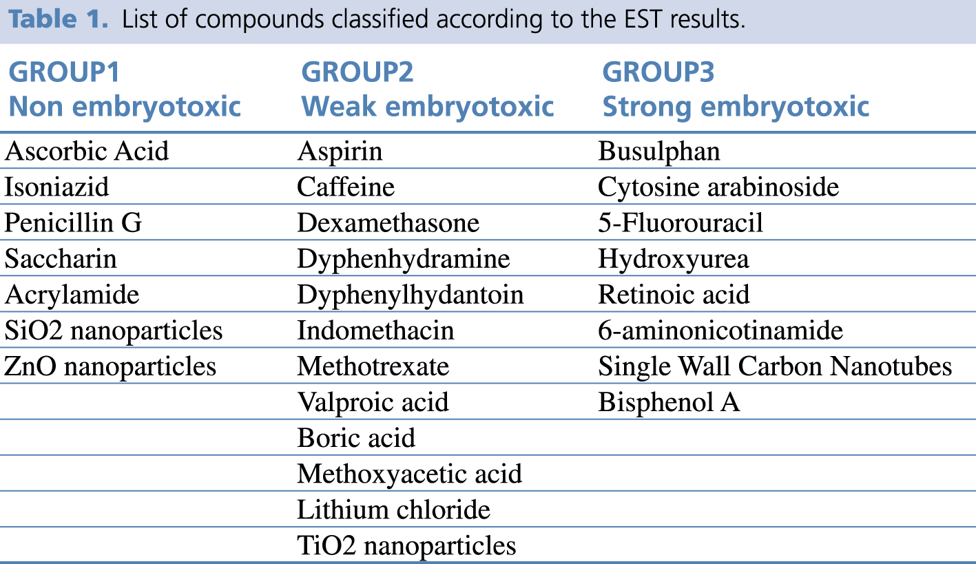 During the validation procedure, 20 different chemical substances have been classified in one of the three EST categories and the in vitro results compared to in vivo data. So far the EST has been used by pharmaceutical and cosmetic companies for drug testing. Tables with the classification of several compounds as strong weak and non-embryotoxic are available (for a summary see table 1).